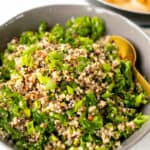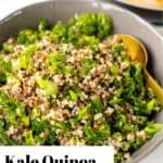 Kale Quinoa Salad in a grey bowl with a gold spoon