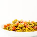 • Cook and drain the pasta according to the package directions. Drain and toss back into the pot it was cooked in. Add in the pesto and stir to coat. Toss in the diced tomato and parmesan cheese and serve!
